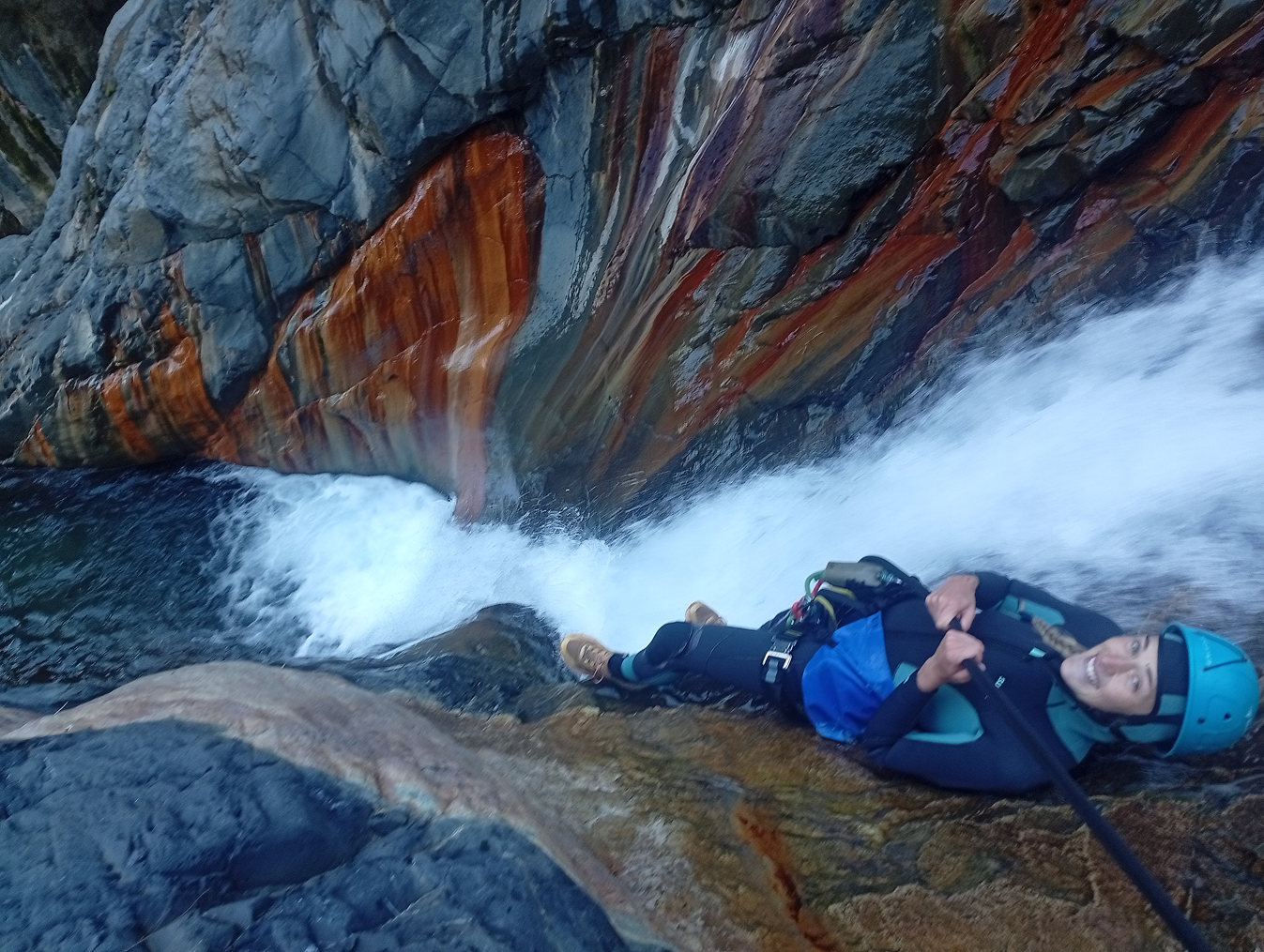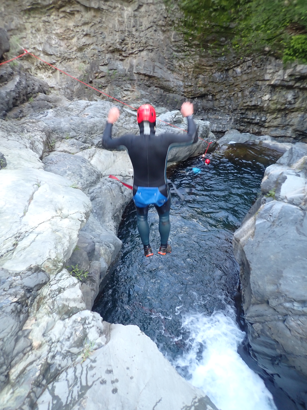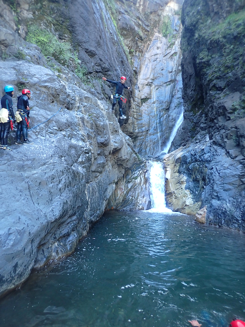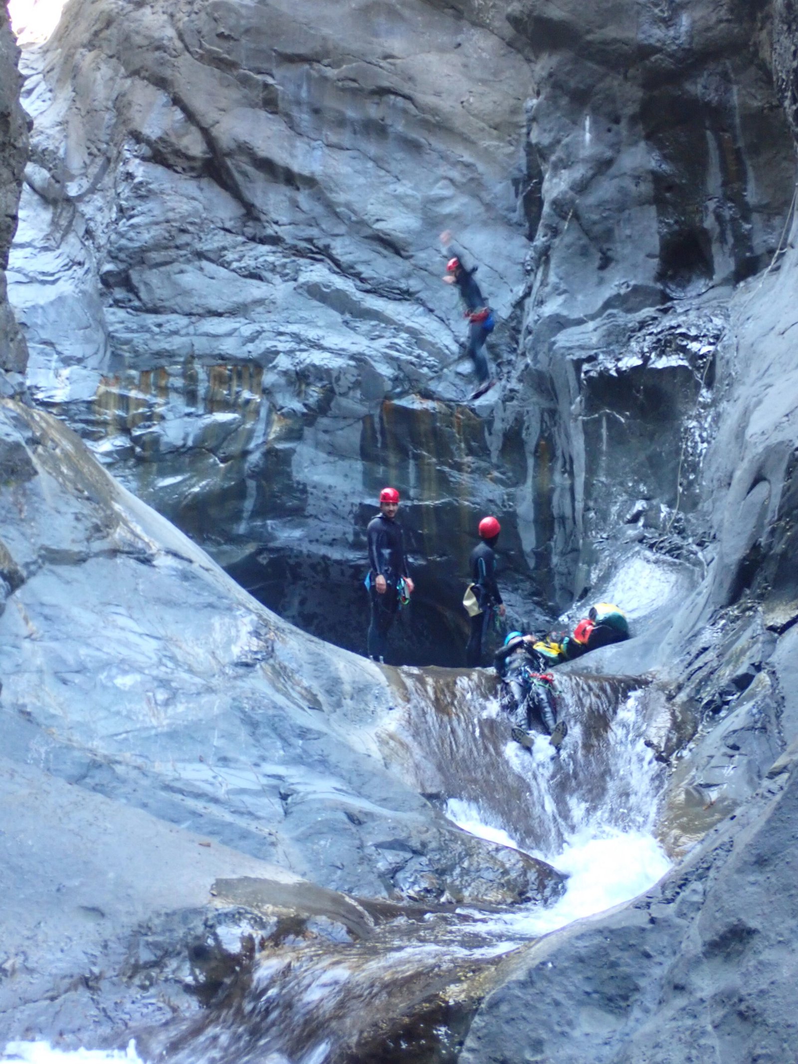 • Équipement complet : combinaison, baudrier, casque, longes, descendeur, sac + bidon étanche